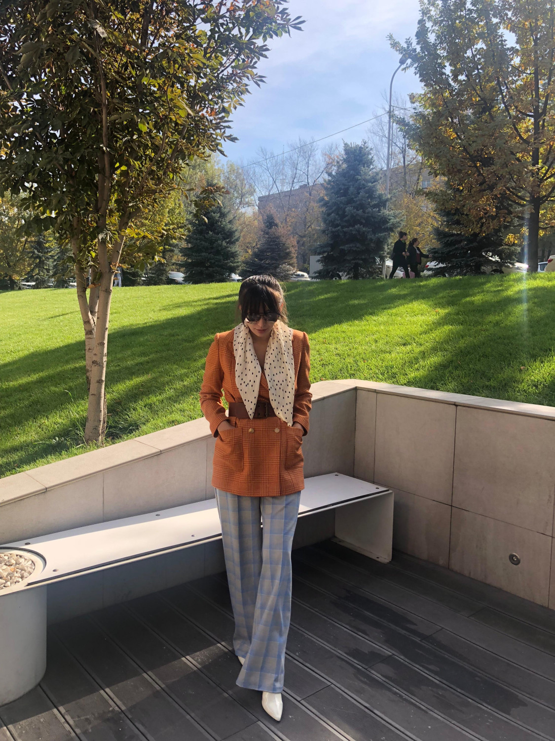 Смешала все возможное — крупная клетка, мелкая клетка, горох — и поддержала светлую обувь в образе платком. Да, очень смело, но сейчас считаю, что лучше «недо», чем «пере»».