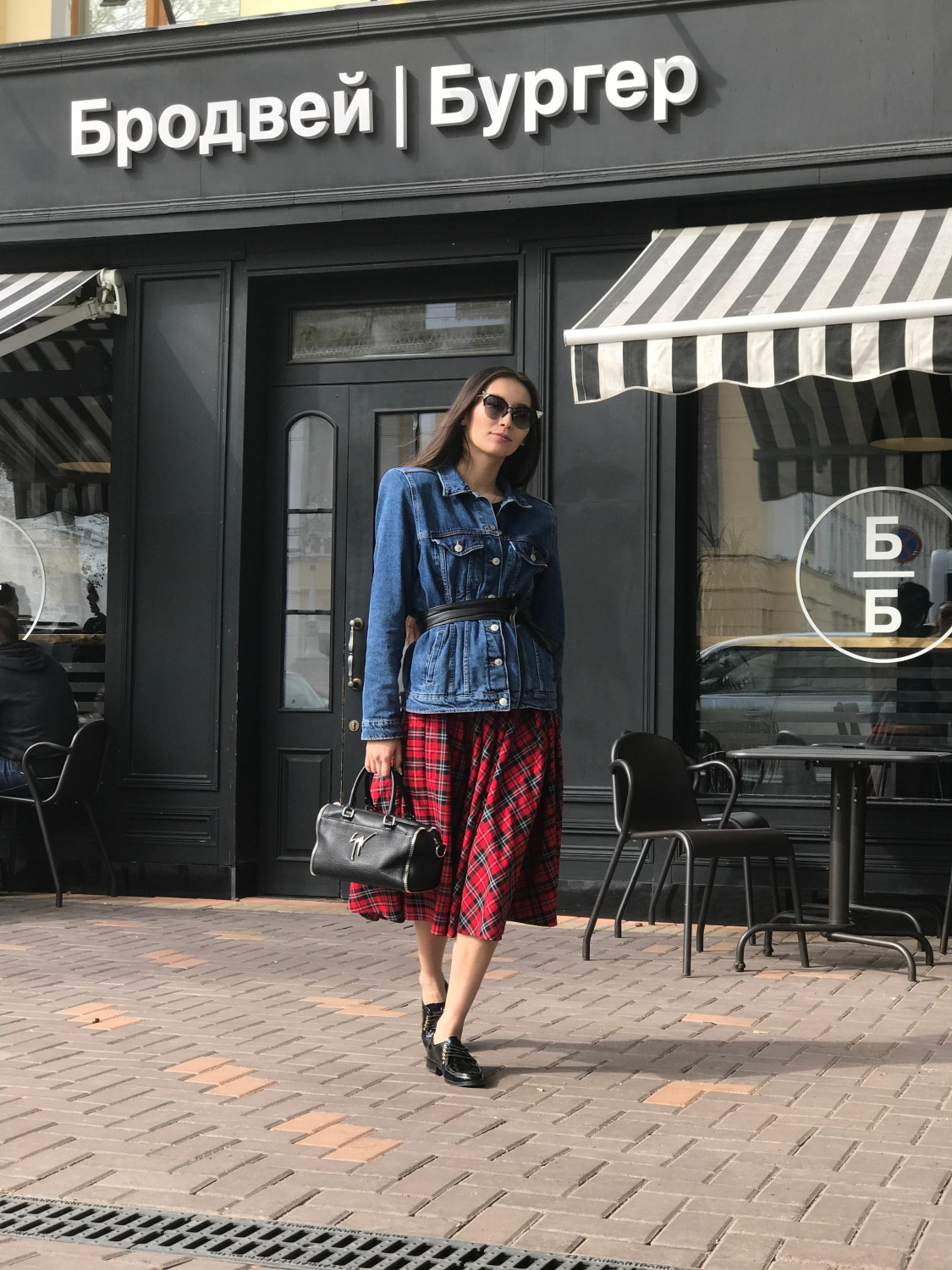 «Казалось бы, безумно актуальные сегодня клетка-тартан и джинсовая куртка с акцентными плечами. Что же не так? Стилизация! Сая из 2024-го года заменила бы обувь, сделав ставку на грубые ботинки.