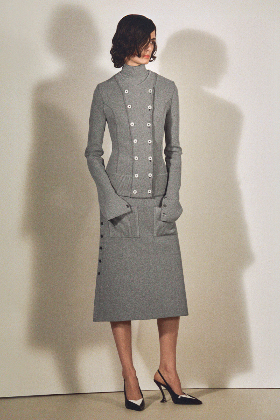 Но коллекция живет не только в истории. Ключевое слово здесь — повседневность. Коппинг выстраивает гардероб как динамичную систему. Короткие накидки соседствуют с твидовыми костюмами и мериносовыми свитерами с декоративными лентами, а черные мини-платья с легкой блестящей бахромой выглядят так, будто готовы к любой городской истории.